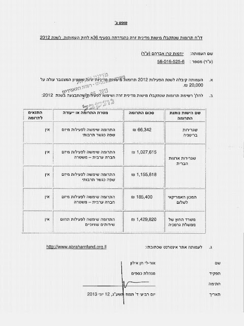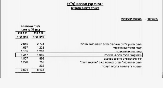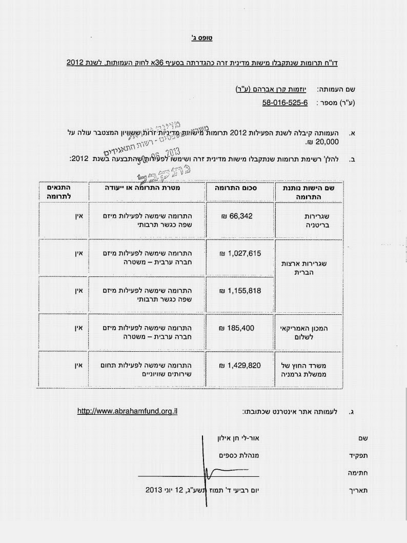 אך מיד בהמשך הדוחות הכספיים, מדווח כי קרן אברהם, מעבירה פרויקטים בהיקפים של בין חצי מיליון ש' ועד מיליון וחצי , (משתנה בין דו"ח שנתי למשנהו*) משגרירות ארה"ב למשטרת ישראל.